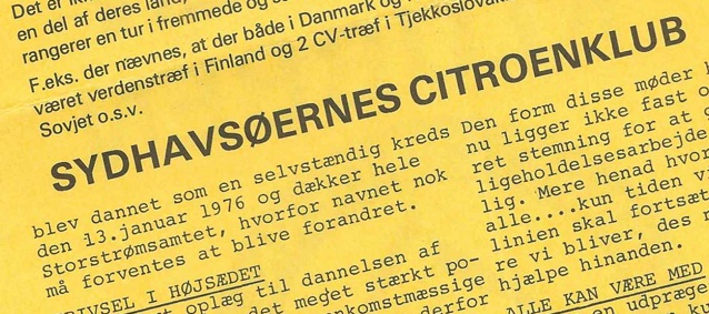 | Der er den 13. januar 2026 gået 50 år siden en gruppe Citroën entusiaster i det daværende Storstrøms Amt satte sig sammen og dannede Sydhavsøernes Citroën Klub. Som der står i den daværende folder, der skulle logge ligesindede til at melde sig ind i klubben, så forventede man, at klubben på sigt skulle ændre navn. Sådan er det ikke gået, for navnet hænger stadigvæk ved efter 50 år. |